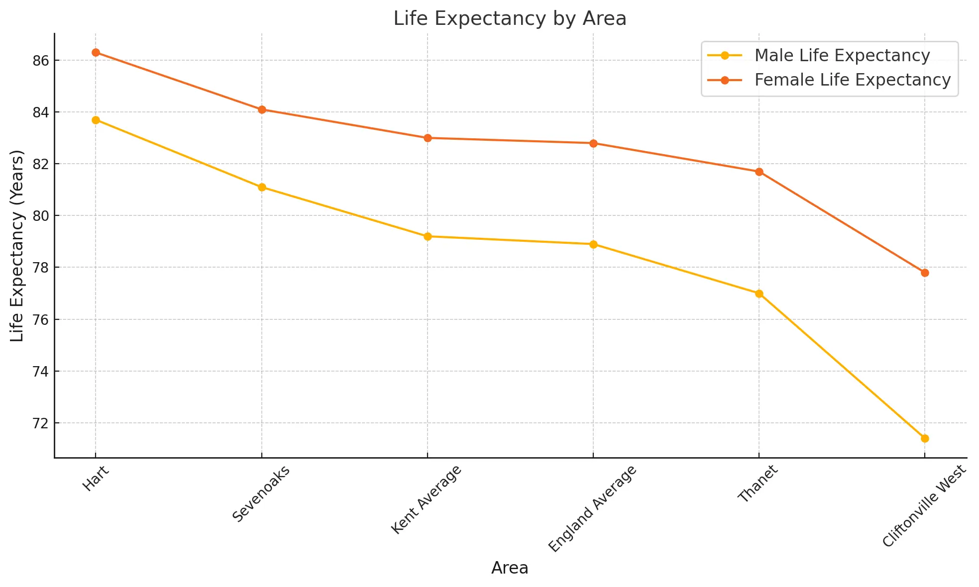 Hi Candy, After reading your comment I dug deeper into the stats and you are absolutely right, the difference is shocking! Cliftonville West has the lowest life expectancy among the areas compared, with males at 71.4 years and females at 77.8 years, while Tunbridge Wells shows significantly higher figures, with males at 80.6 years and females at 83.8 years. We have updated the chart to include the information on Cliftonville West. Thank you.